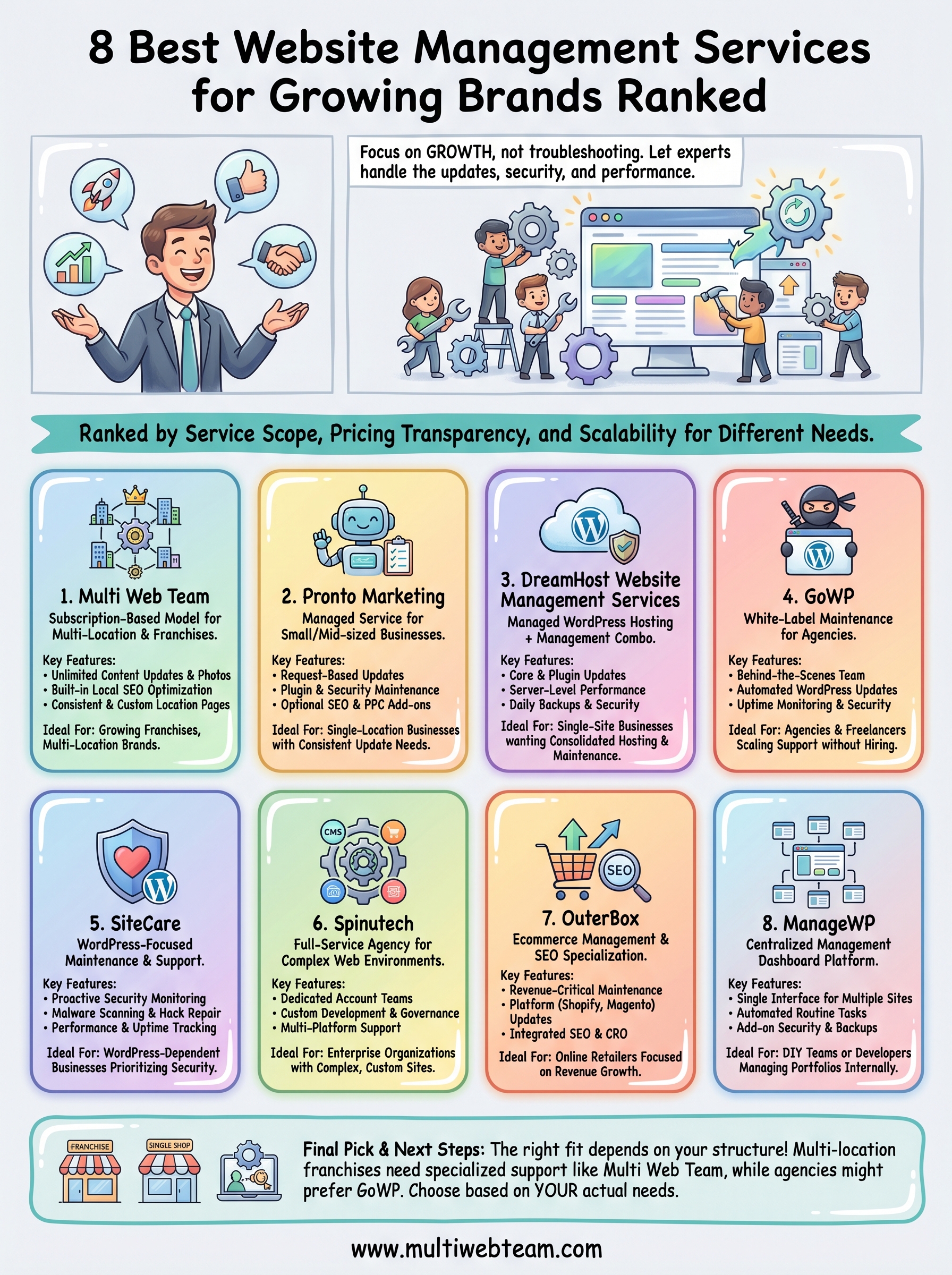 We put together this ranked list of eight website management services worth considering in 2026. Each one was evaluated on service scope, pricing transparency, and scalability , the factors that matter most when you're growing. Whether you run a single storefront or a franchise with locations across the country, this breakdown will help you find a management partner that fits your actual needs.