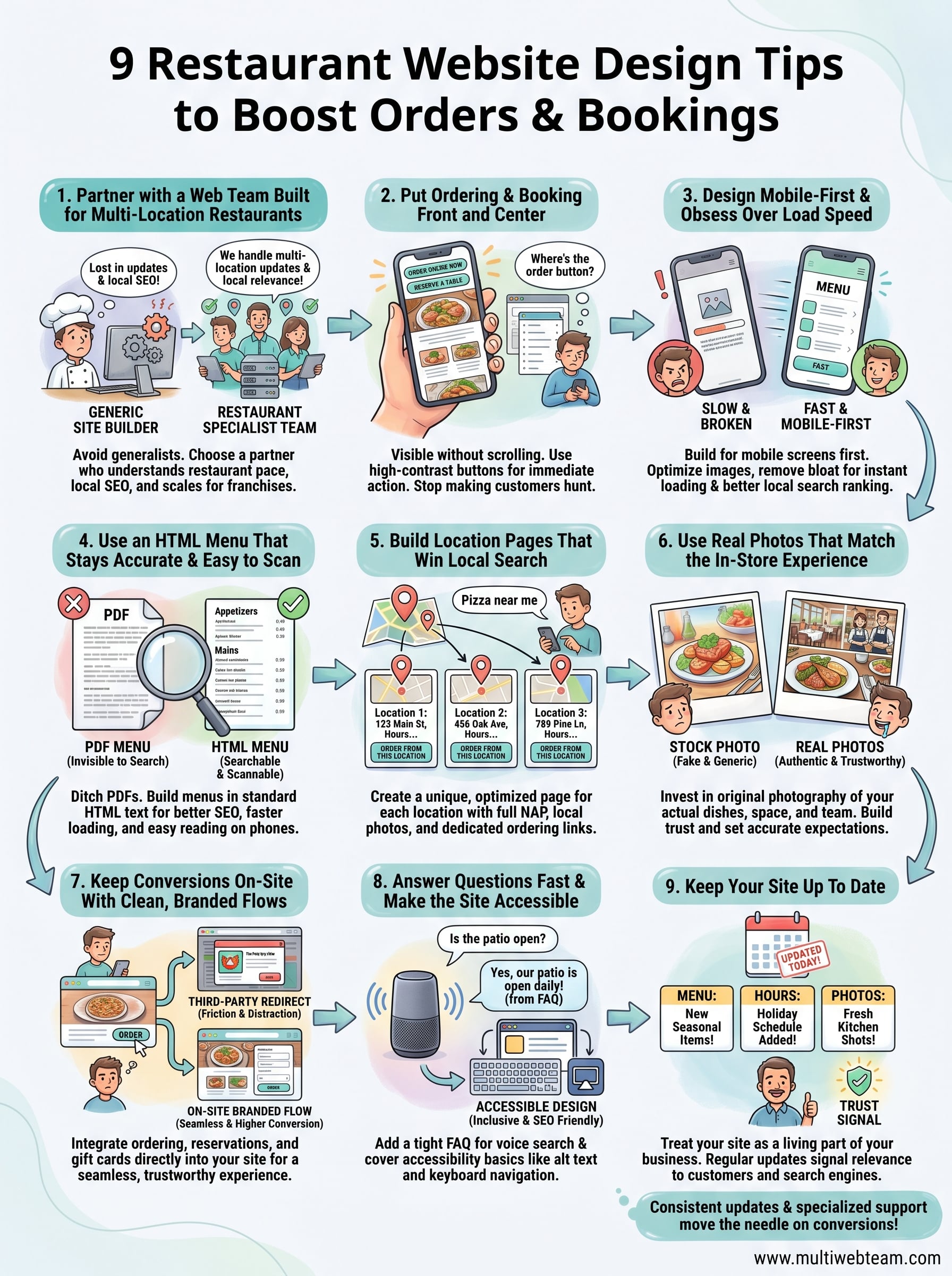 At Multi Web Team, we build and manage websites for multi-location restaurants and food service franchises. We've seen firsthand what works, what doesn't, and what actually moves the needle on conversions. This article breaks down nine specific design tips we recommend to restaurant owners who want their website to pull its weight, driving more online orders, more reservations, and more foot traffic to every location.