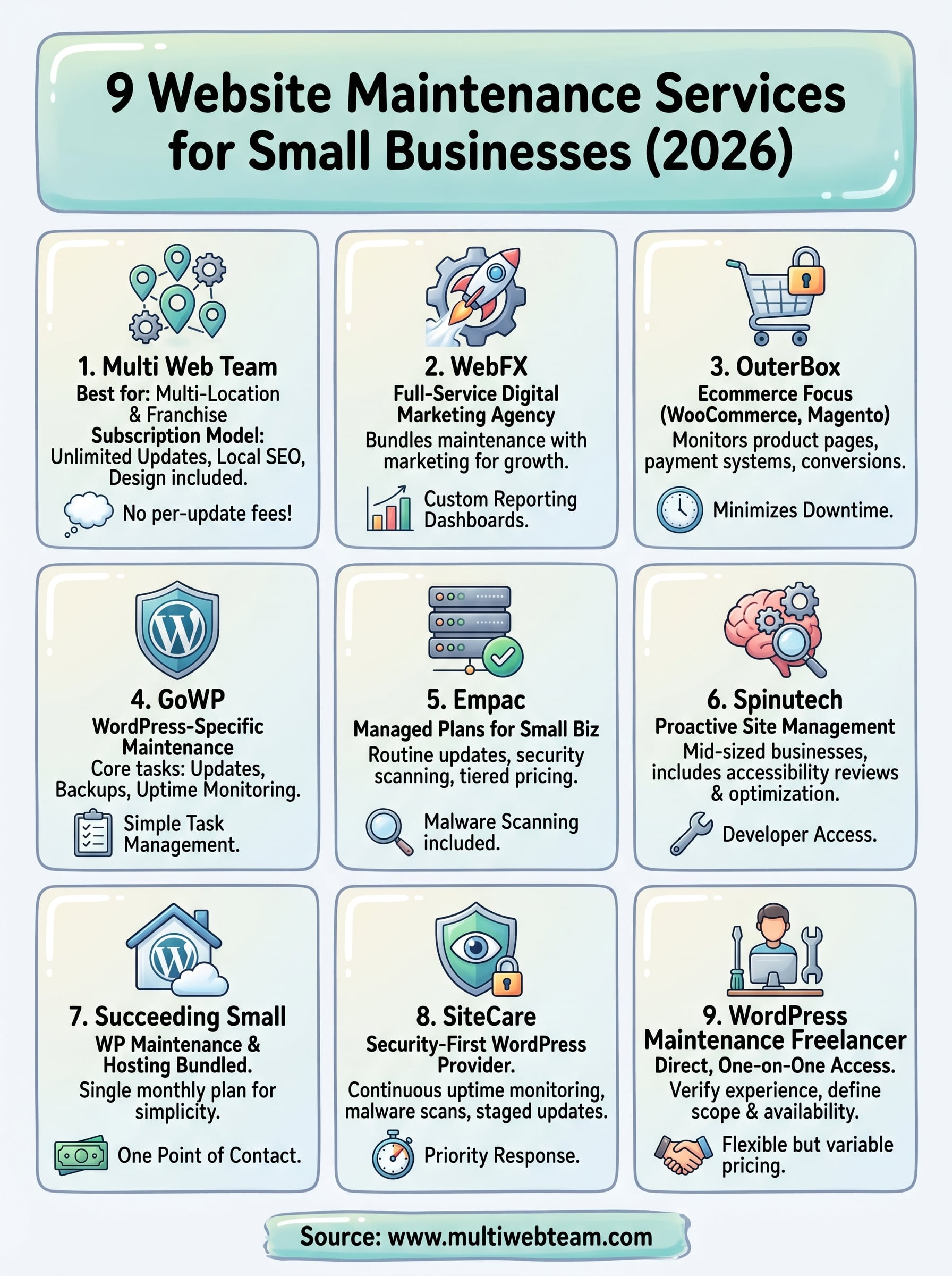 This guide breaks down nine website maintenance services worth considering in 2026. We'll cover what each one offers, how pricing works, and where each provider stands out, so you can pick a partner that matches your budget and keeps your site running without the headaches.