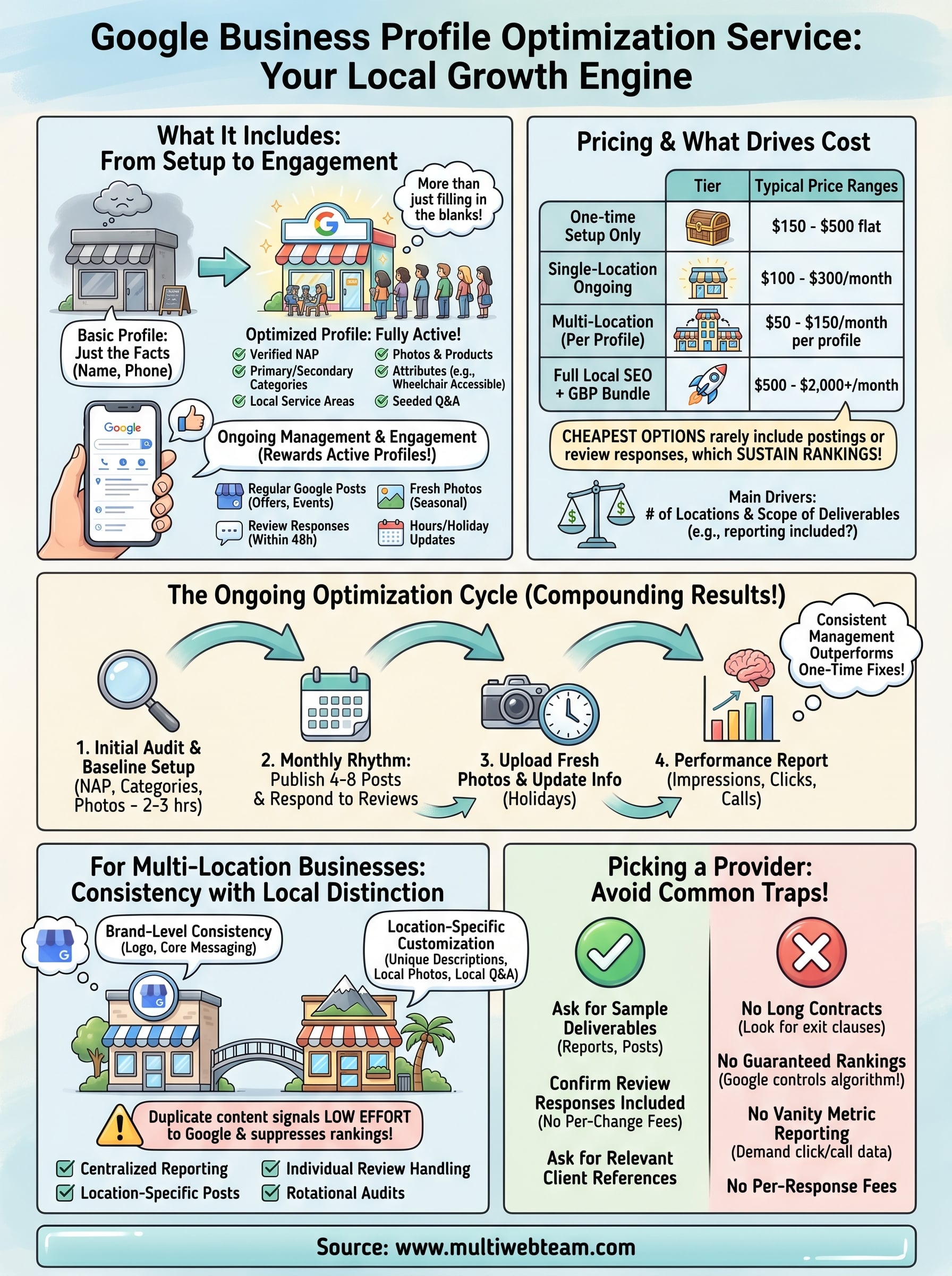 You now know what a google business profile optimization service actually covers, how pricing works, and what separates a provider worth hiring from one that will waste your budget. The next move is straightforward: audit your current profiles before you contact anyone. Check each location for missing fields, outdated hours, and photos that no longer represent your business. That audit gives you a clear starting point and makes it easier to evaluate whether a provider's scope matches what you actually need.