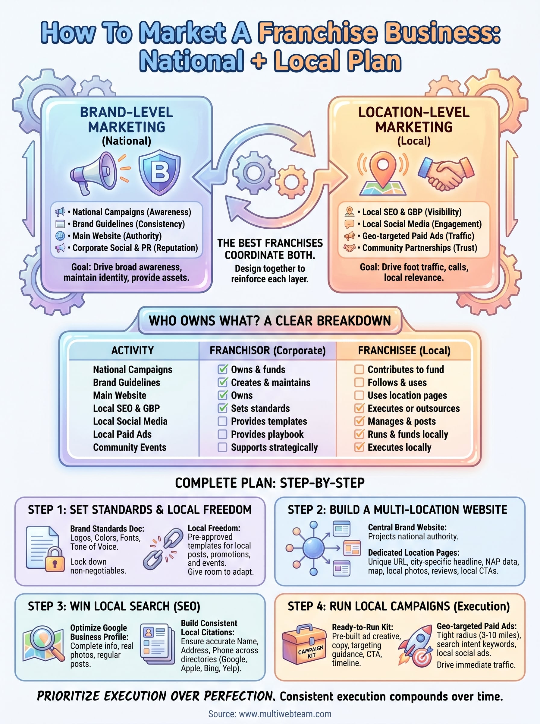 At Multi Web Team, we build and manage websites specifically for multi-location businesses and franchises, handling everything from local SEO optimization to ongoing content updates across every location. We see firsthand what separates franchise marketing that works from the kind that just drains budgets. This guide breaks down a complete national + local marketing plan, step by step , so you can build a strategy that actually scales with your franchise.
