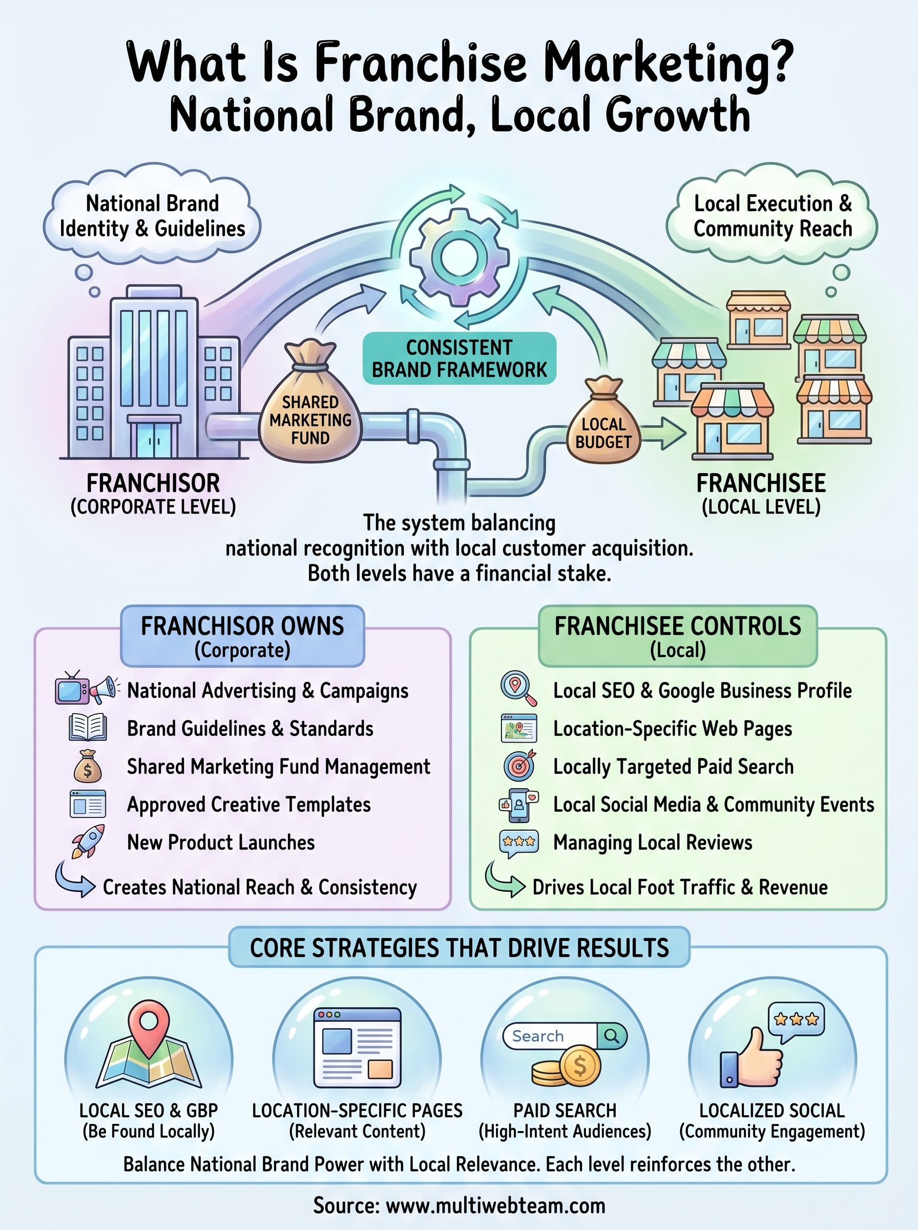 This article breaks down how franchise marketing works, what separates it from traditional marketing, and the strategies that connect national brand power to local growth. At Multi Web Team, we build and manage websites for multi-location businesses and franchises every day, so we've seen firsthand how the right local strategy compounds when it's backed by a consistent brand framework . We'll share that perspective throughout.